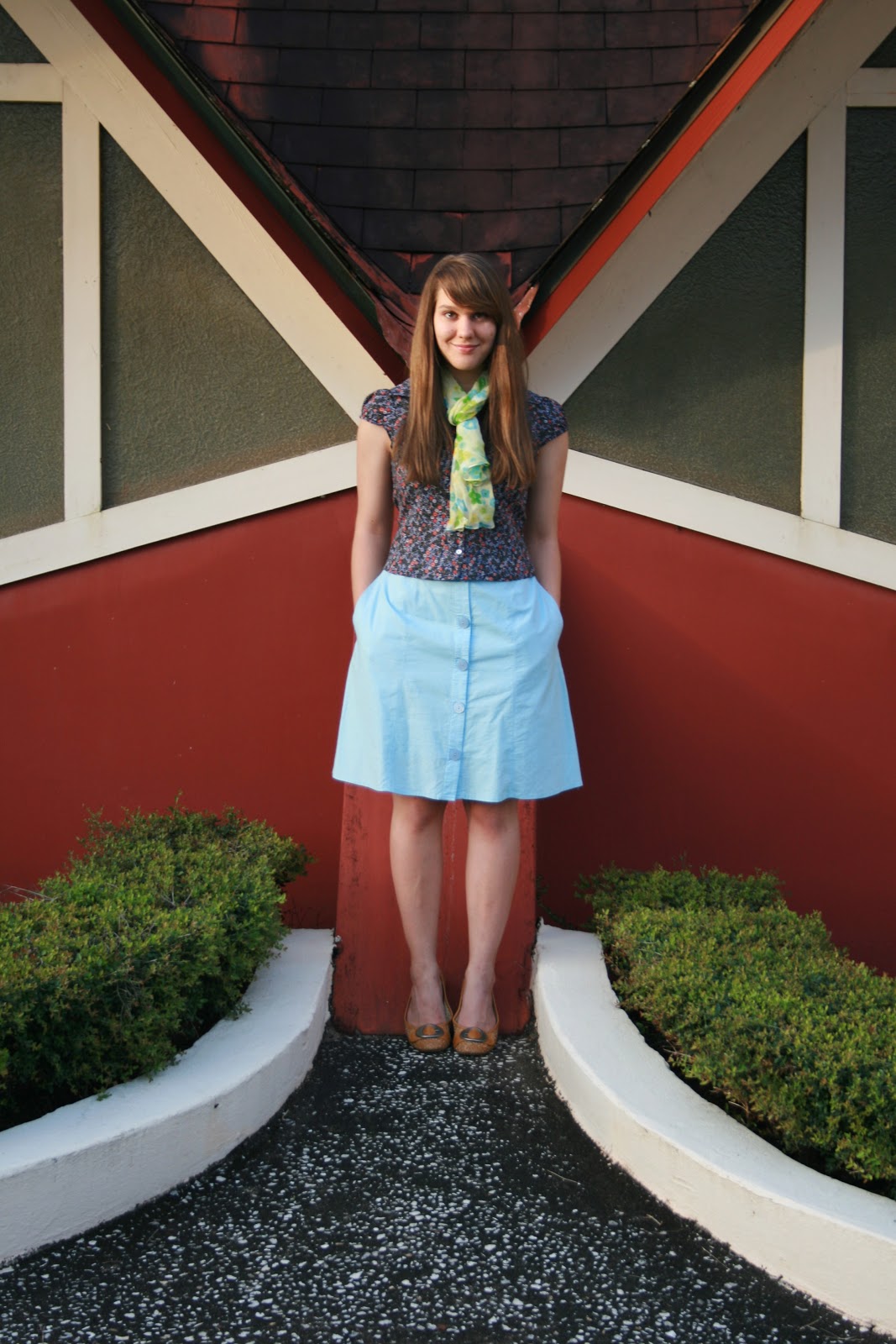 This skirt is the first article of clothing that I made myself. Not altered, repurposed, or changed into something else... completely made from scratch. Like, it was nothing but fabric and some buttons before I sewed it all together. The feeling of accomplishment it woven into its fibers. But moreover, I made it at my grandmother's house with her by my side, guiding me through the process. She works magic with a sewing machine. I'm totally inspired by her work room: so many tools, threads, fabrics, embellishments. She's always making things for her grandchildren (and great grandchildren). I was planning on making several items at her house, but time always got away from me. For now, this light blue skirt is the only one to live to tell the tale. There are some good memories in that skirt.